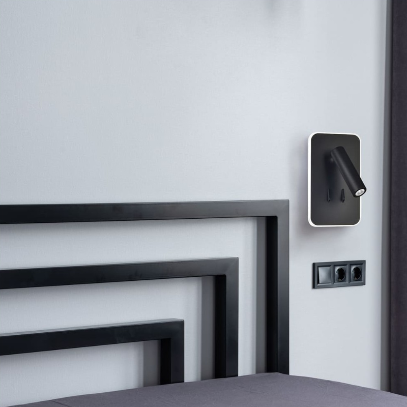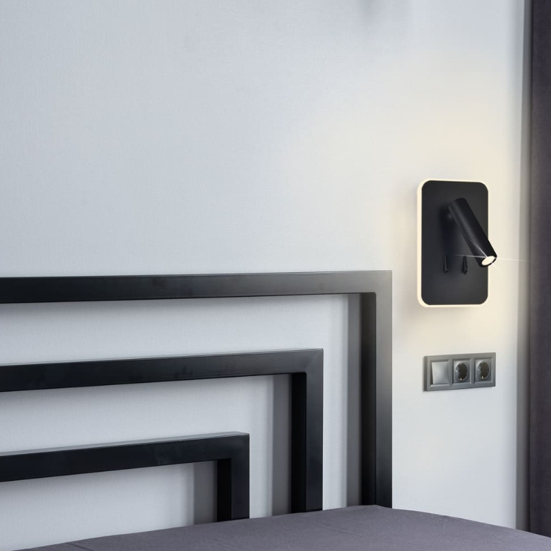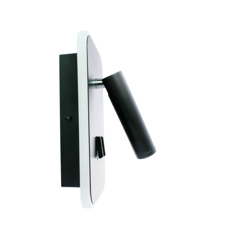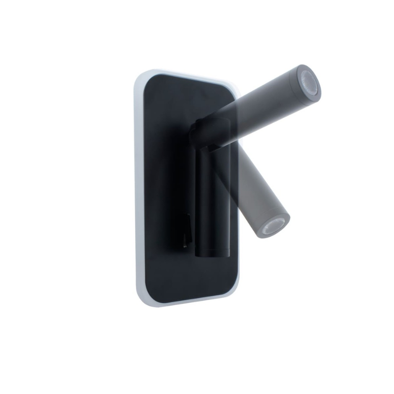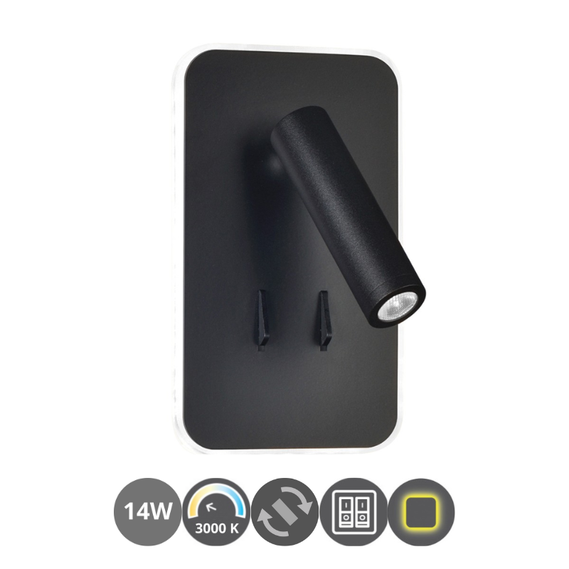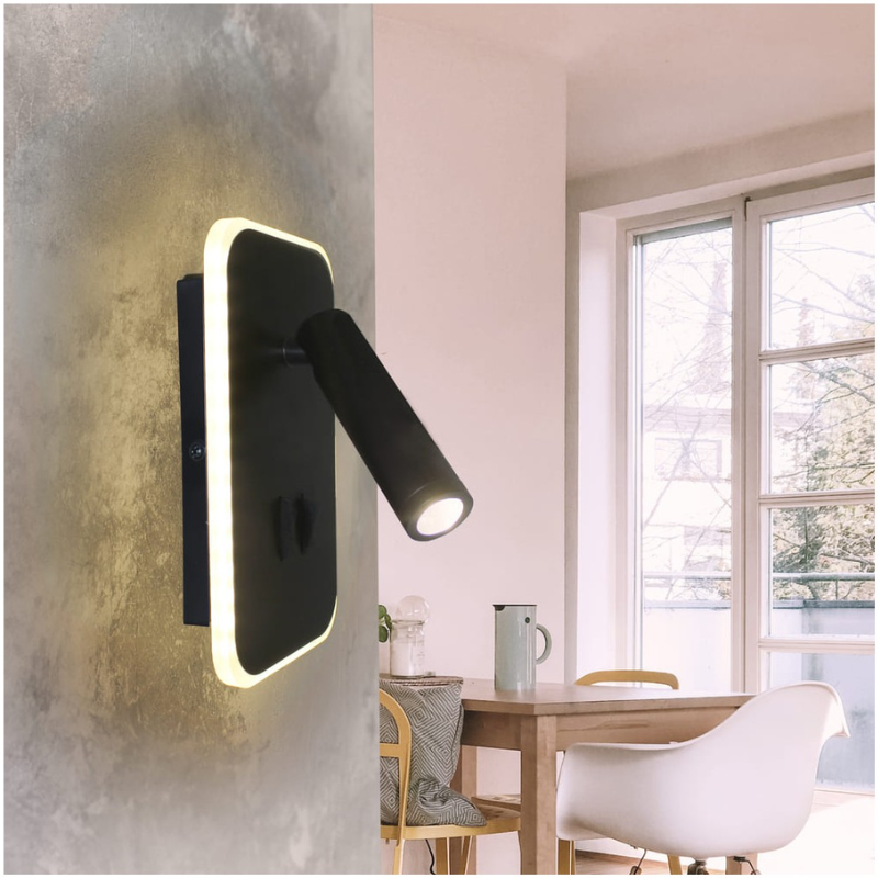 Aplique de pared led, lector foco direccional de 3w luz cálida. Se puede encender solo o junto con la luz led decorativa de 11w cálida alrededor del aplique. Tres opciones de encendido diferentes en un mismo aplique de pared. Perfecto para cabeceros de cama o pared del sofá. Fabricado en aluminio lacado en negro.
