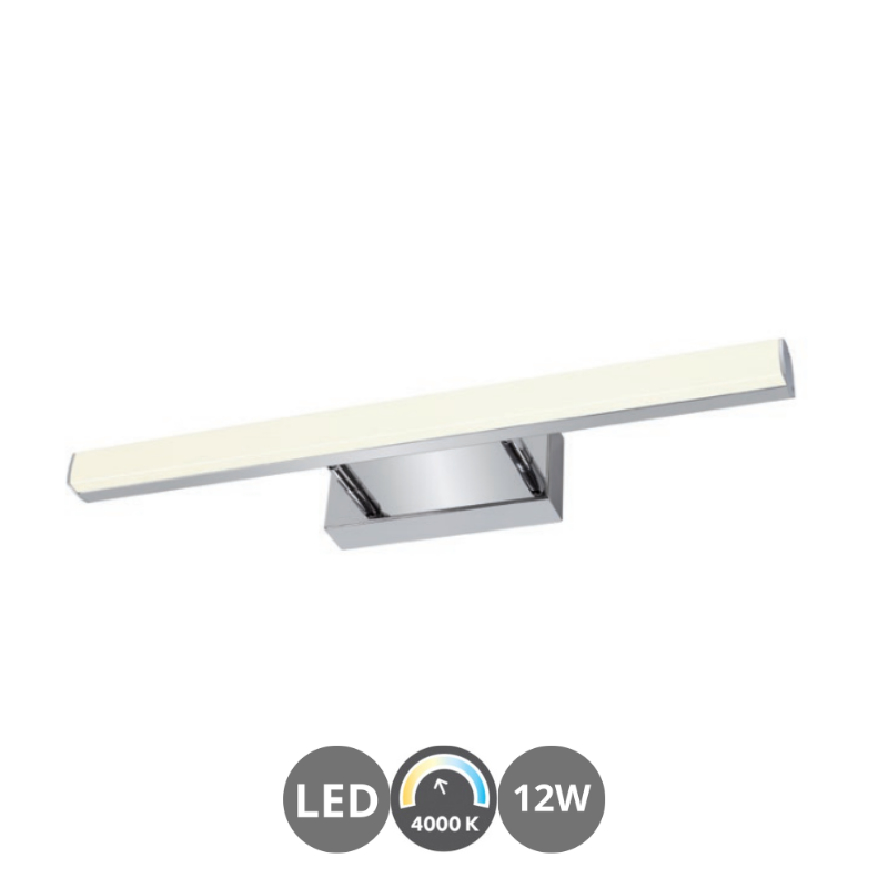 Aplique pared para baño KASSEL. Consumo 12 watt. Luminosidad 1150 lumen. Temperatura 4000 kelvin. Estanco IP44. Difusor acrílico PC blanco mate con armazón de aluminio baño Cromado. Garantía 3 años. Zona aconsejada , pared baño.