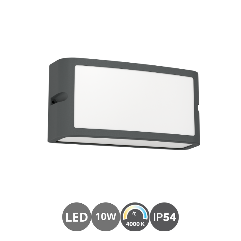 Aplique LED exterior de 10 watts, 1200 lúmenes y 4000 kelvin con diseño moderno en acabado gris antracita, ideal para fachadas y terrazas. Tiene una alta resistencia a la intemperie con IP54.