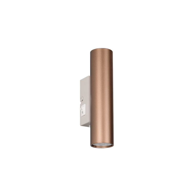 Aplique de interior TARYN para 2 bombillas GU10 fabricado en metal color café. Sus medidas son 4×18 centímetros de alto. Bombillas no incluidas. Aconsejamos nuestras bombillas led.
