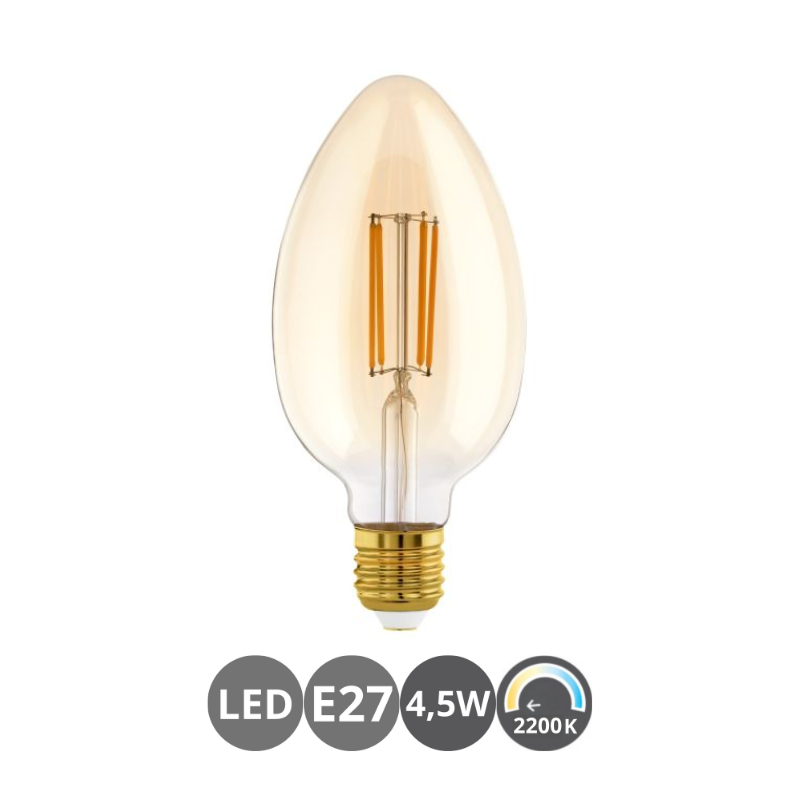 Bombilla LED E27 vela caramelo transparente con filamenta de 4,5 watts, 470 lúmenes y 2200 kelvin . Sus medidas son: 8 cm de diámetro y 17 centímetros de altura. Intensidad regulable: Si.