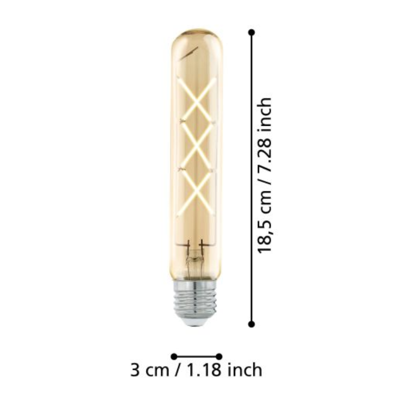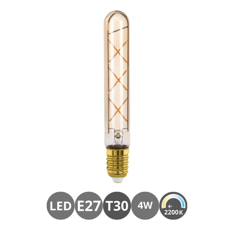 Bombilla LED E27 T30 caramelo transparente con filamento de 4 watts, 350 lúmenes y 2200 kelvin . Sus medidas son: 3 cm de diámetro y 18,5 centímetros de altura. Intensidad regulable: No.