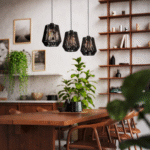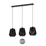 Lámpara PERSLEY para 3 bombillas led E27 con diseño industrial en acero negro y pantallas en papel trenzado. Bombillas no incluidas. Aconsejamos nuestras bombillas led.