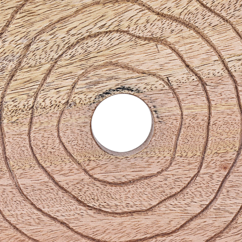 Decoración abstracta fabricada en madera natural de mango, dándole exclusividad a cada pieza con base de metal negro. Sus medidas son 26cm de diámetro, 10 cm de ancho y 35,5 centímetros de alto.