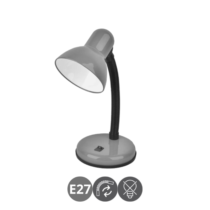 Flexo infantil YODO E27 gris con cabezal orientable y giratorio. Sus medidas son: 30 cm de alto y 14 centímetros de diámetro. Material: metal. Portalámparas: 1 x E27 (Bombilla no incluida). Aconsejamos nuestras bombillas led.