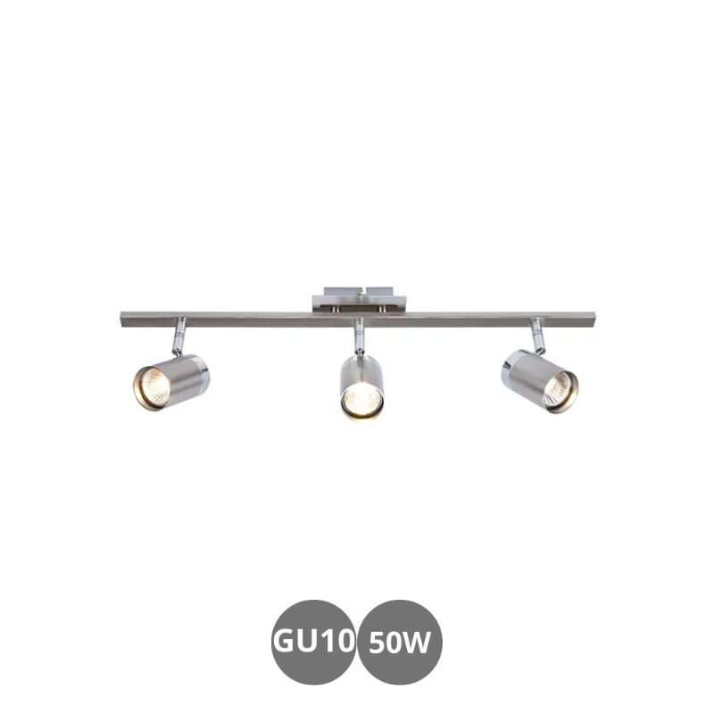 Foco de 3 luces para bombilla GU10 con potencia máxima de 50 watts por bombilla. Acabado metal níquel satinado y cromo. Bombillas no incluidas. Aconsejamos nuestras bombillas led.