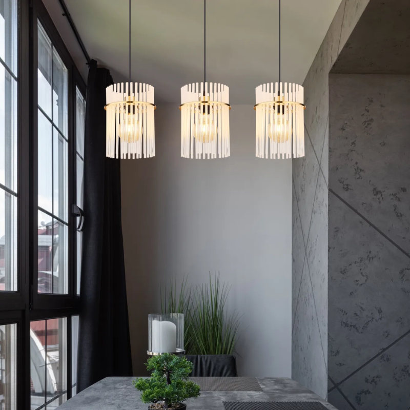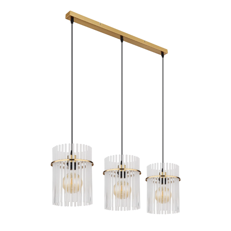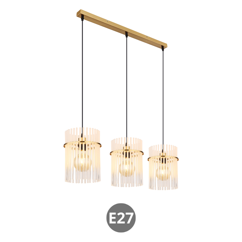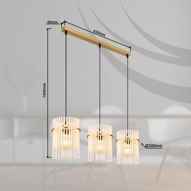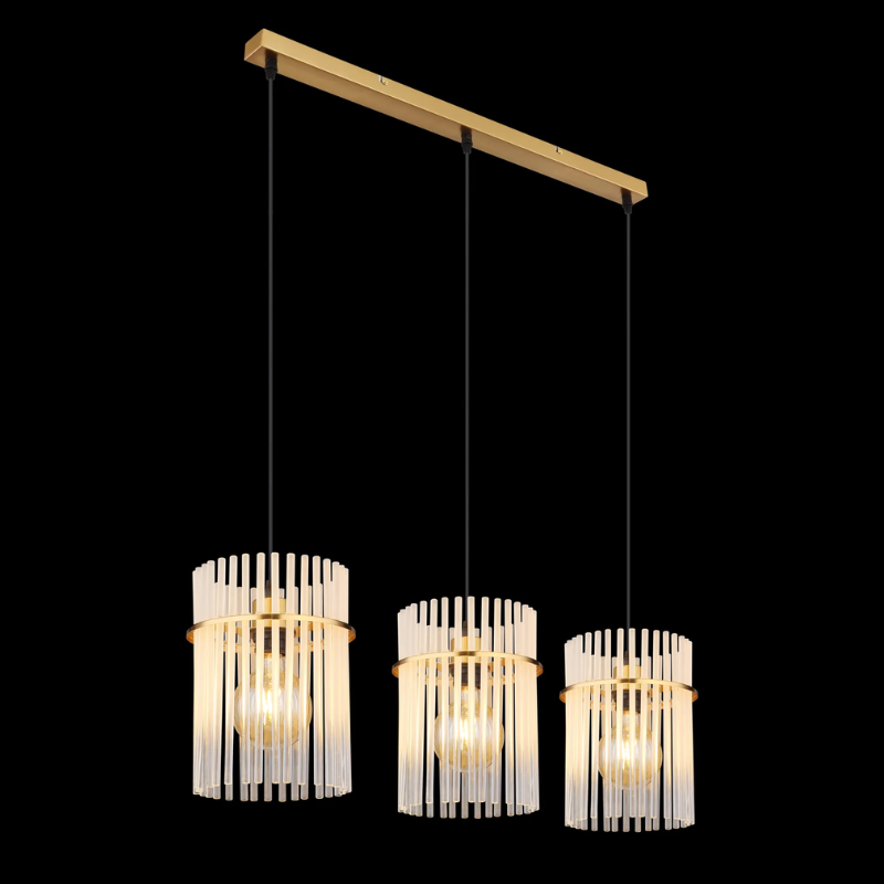 Lampara colgante GOREY 65cm de ancho base y 140cm de largo para 3 bombillas E27 fabricado en varillas de vidrio y metal. Bombillas no incluidas. Aconsejamos nuestrasbombillas led. Ideal para luz mesa comedor, salita, dormitorio…