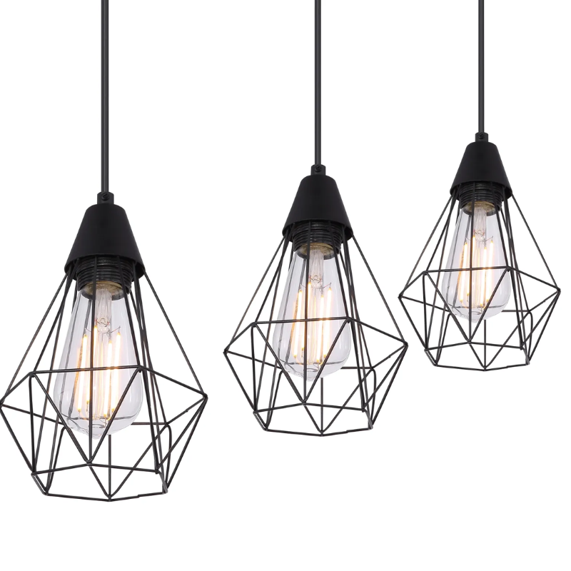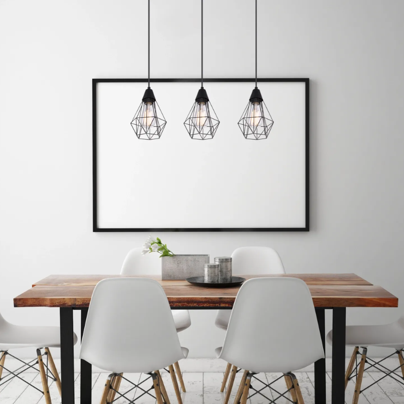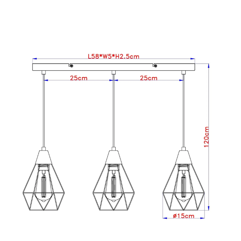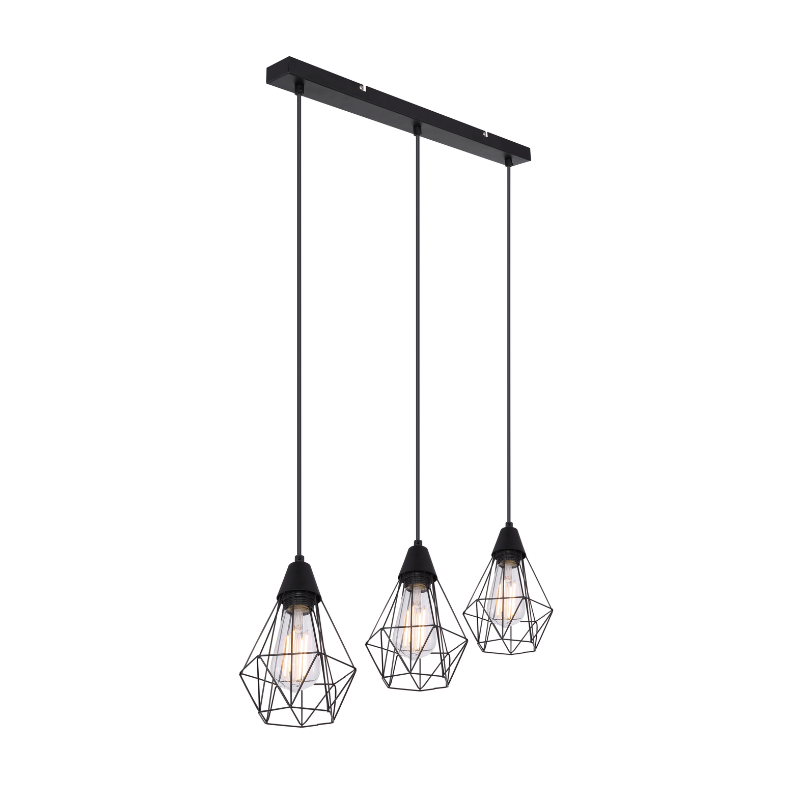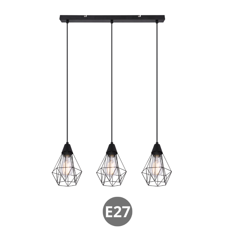 Lámpara de 58 centímetros de largo y 120cm de alto para 3 bombillas led E27 fabricada en metal negro. Bombilla no incluida. Aconsejamos nuestras bombillas led.