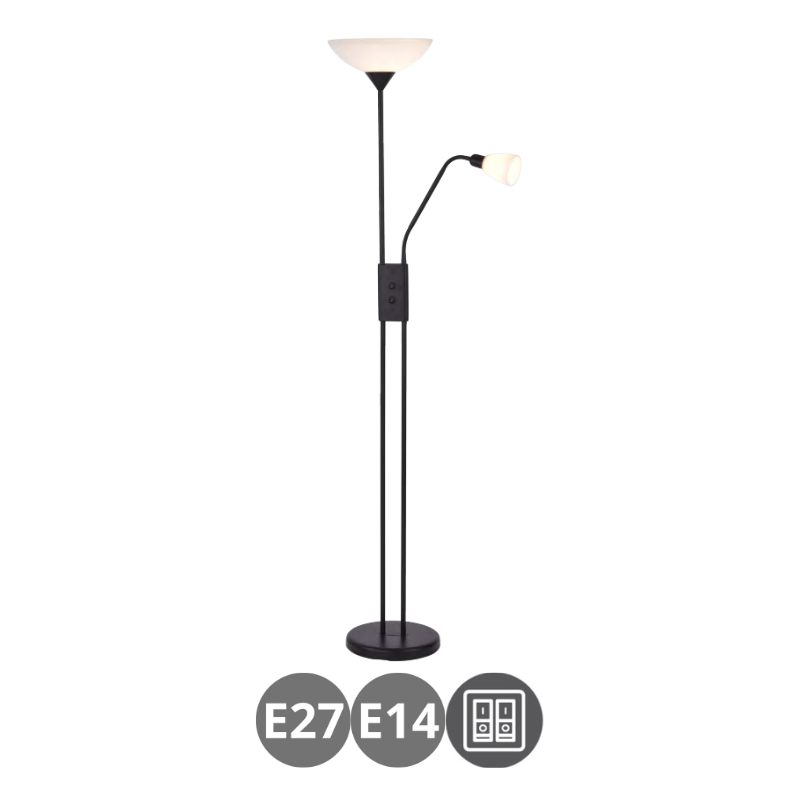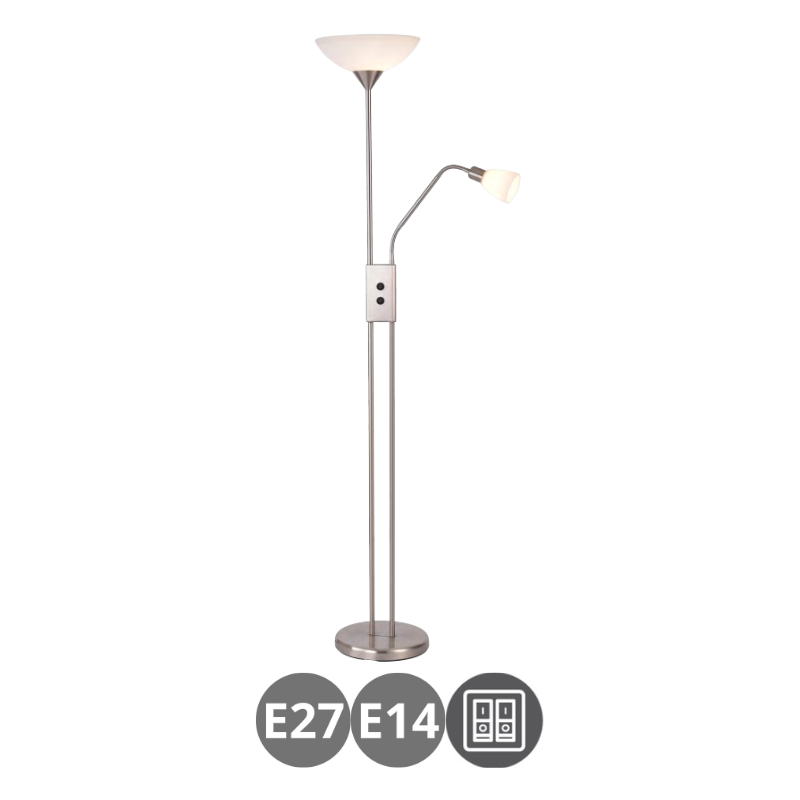 Lámpoara de pie LECTOR para bombillas E27 y E14 acabado níquel mate. Encendida mediante interruptor. Bombillas no incluidas. Aconsejamos nuestras bombillas led.