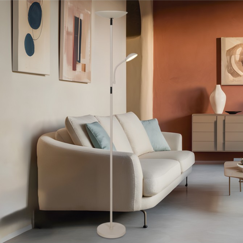 Lámpara de pie led KOS 18 watts regulables de 3000 a 6500 kelvin y 1900 lúmenes con lector de 5 watts, 3000 kelvin y 470 lúmenes. Encendida y regulable mediante doble interruptor en tubo.