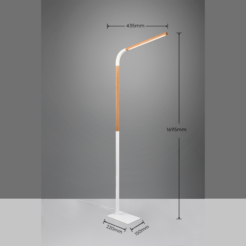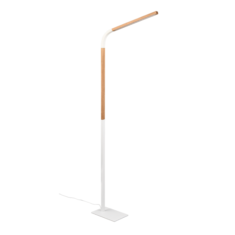 Lámpara de pie led NORRIS led 11 watts, 3000 kelvin, 1400 lúmenes . Medida 1695 x 435 milímetros. Base metal blanco y madera. Zona recomendada: Salón, salita, comedor, recibidor, pasillo, dormitorio…