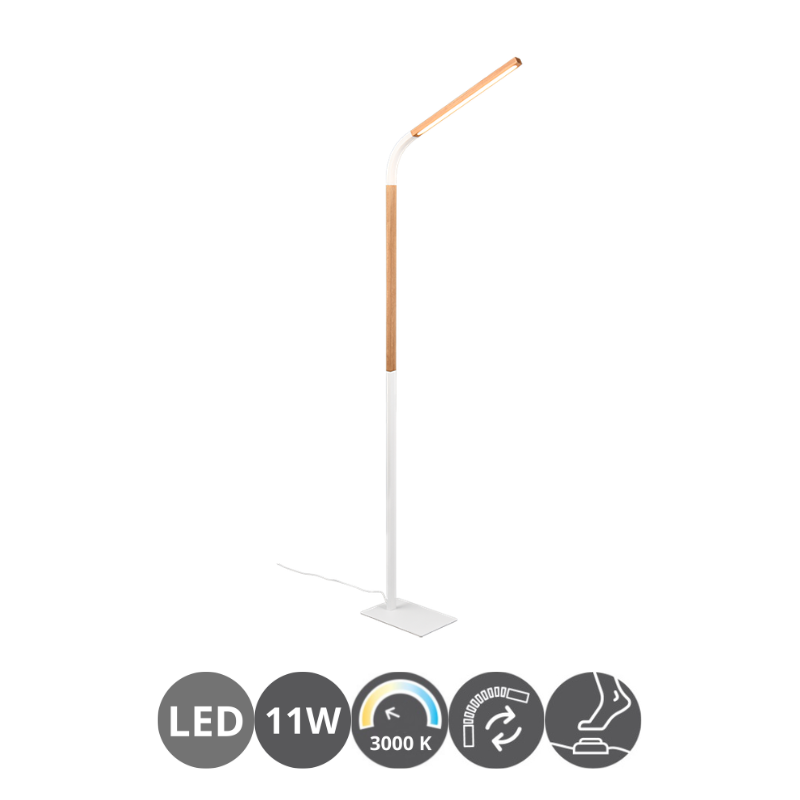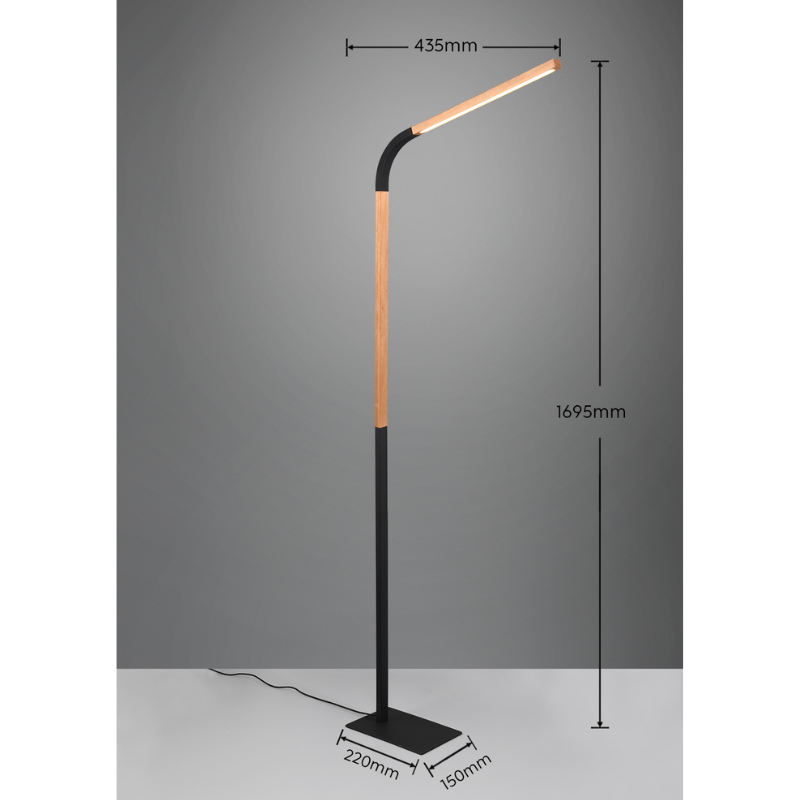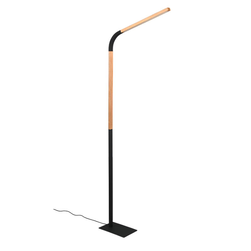 Lámpara de pie led NORRIS led 11 watts, 3000 kelvin, 1400 lúmenes . Medida 1695 x 435 milímetros. Base metal negro y madera. Zona recomendada: Salón, salita, comedor, recibidor, pasillo, dormitorio…