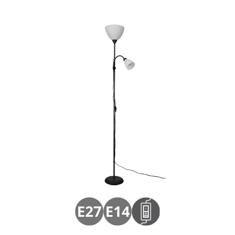 Lámpara de pie MONTANINI para bombilla E27 en la luz principal y bombilla E14 en el lector, fabricado en metal negro y tulipas de plástico blanco. Bombillas no incluidas. Aconsejamos nuestras bombillas led.