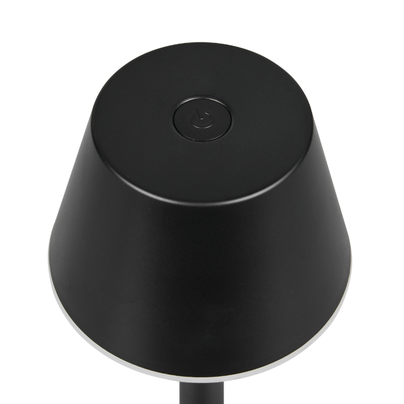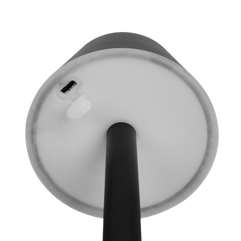 Lámpara de sobremesa led VIDAL de 1,5 watts, 3000 kelvin y 150 lúmenes con encendida mediante interruptor táctil y batería recargable mediante conexión USB fabricada en plástico color negro.