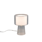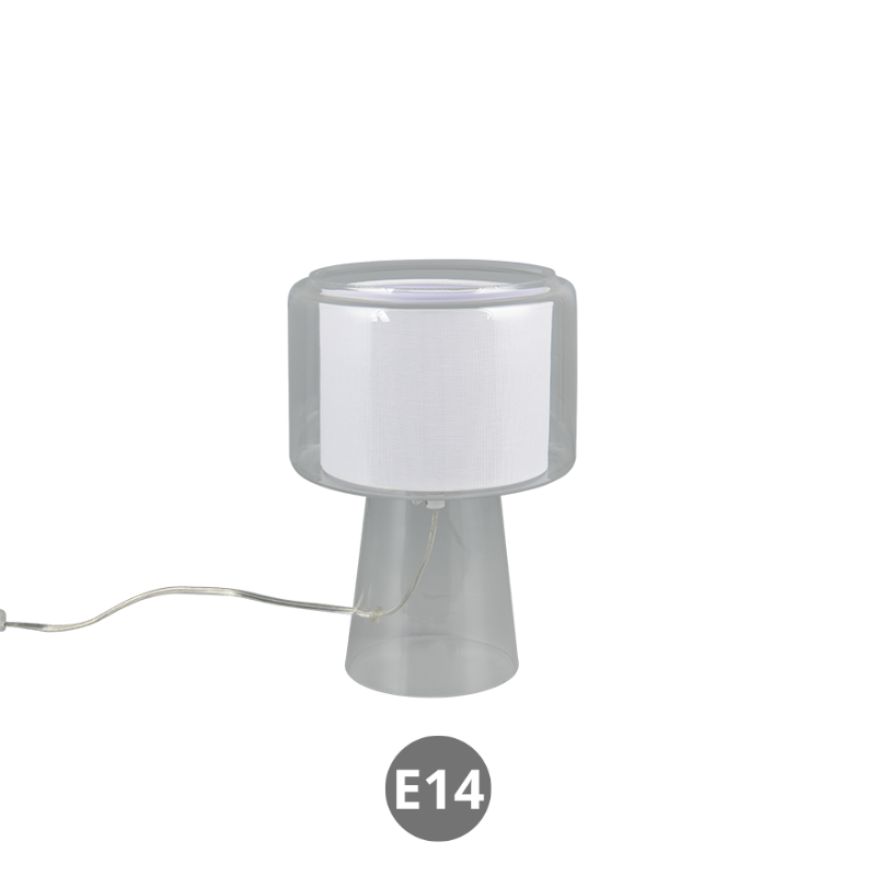 Lámpara de sobremesa ROCKA para bombilla E14 fabricada en cristal transparente y pantalla en tela blanca. Con interruptor en el cable. Bombilla no incluida. Aconsejamos nuestras bombillas led.