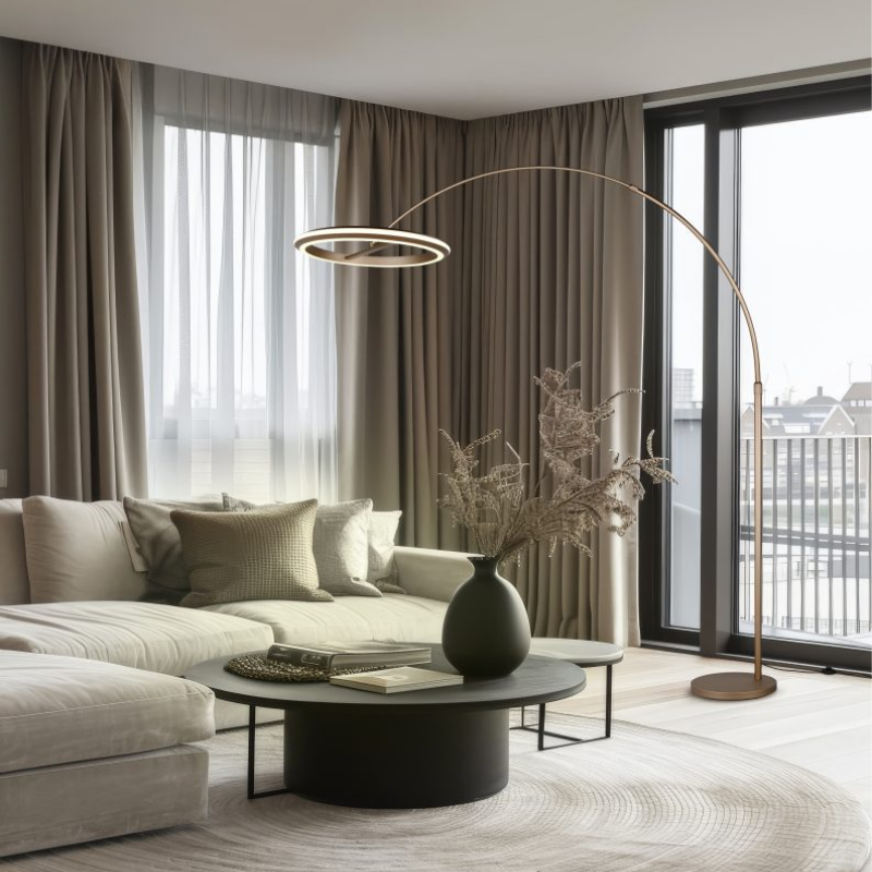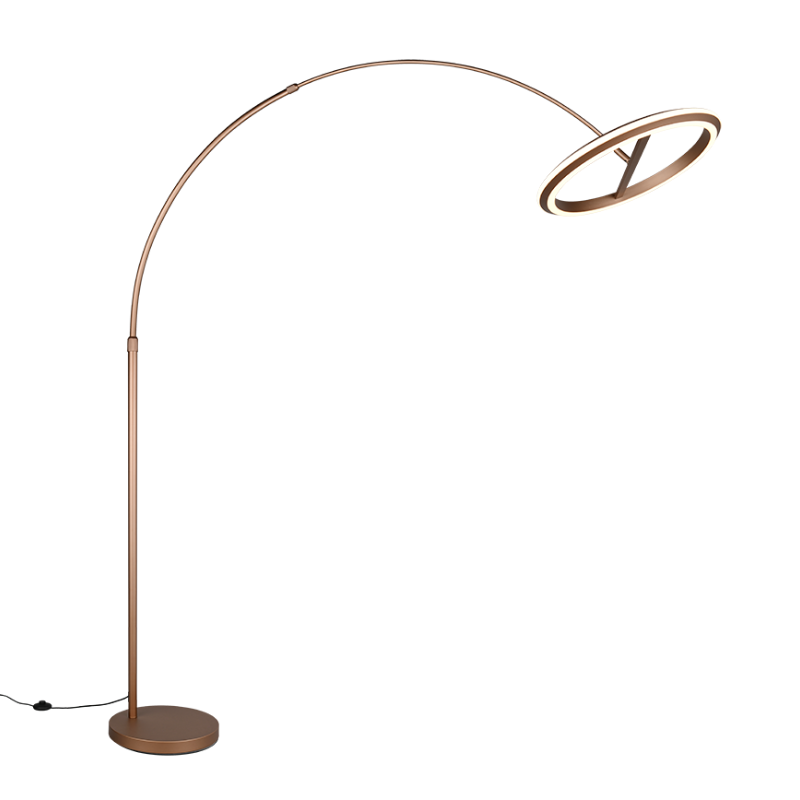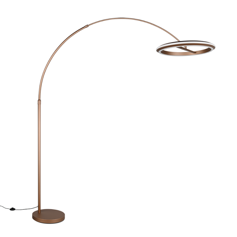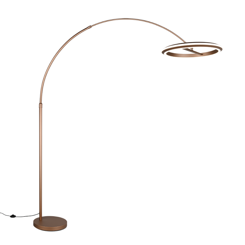 Lámpara de pie led AMADOR 2300 – 3000 – 4000 kelvin y 2400 lúmenes regulable de intensidad fabricado en metal café. 205cm de alto.