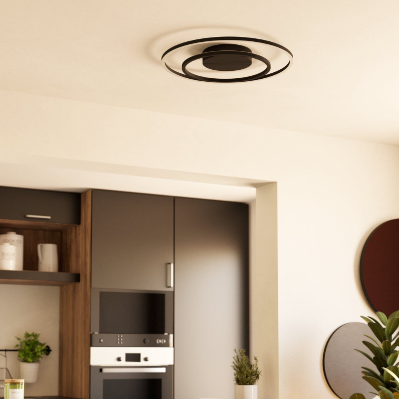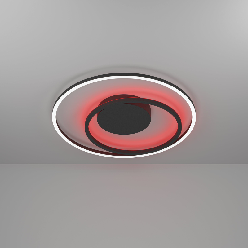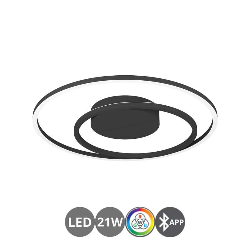 Plafón Led CALAGRANO de 21,5 watts y 2700 lúmenes 3000 – 4000 – 6000 kelvin CCT + RGB con control mediante aplicación móvil bluetooth. Material, metal y plástico negro. Medidas: 45 cm de diámetro.