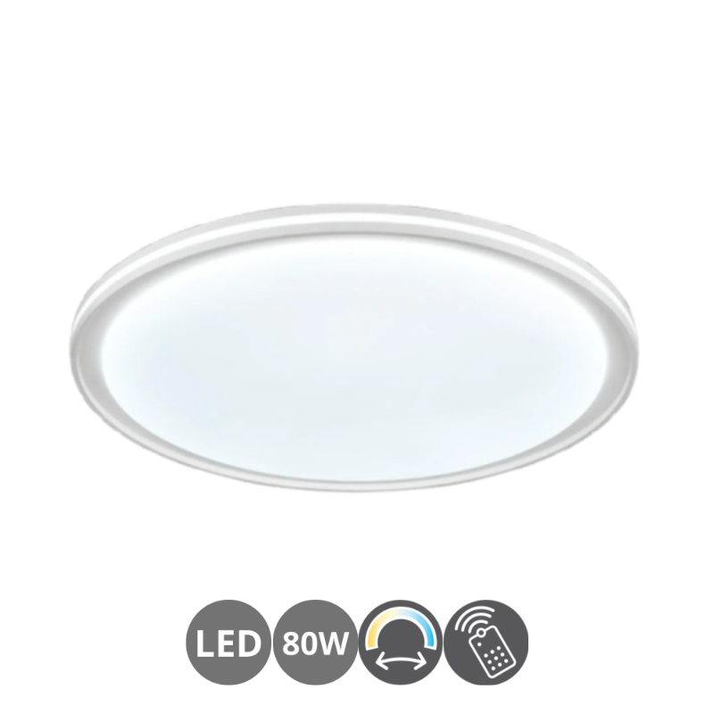 Plafón led OVNI 50 de 80 watts y 6.800 lúmenes color de luz CCT regulable 3000 / 4000 / 6000 kelvin. Con mando a distancia. Material metal y metacrilato blanco mate. Medida: 50 centímetros de diámetro.