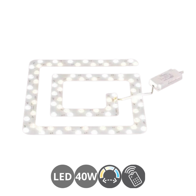 Recambio placa led CCT de 40 watts y 5040 lúmenes con mando a distancia para ventiladores y plafones. Color de luz LED blanco Cálido, Frío y Natural. (3000 – 4000 – 6000 Kelvin) Regulable mediante mando a distancia. Incluye driver y mando a distancia. 25x25cm