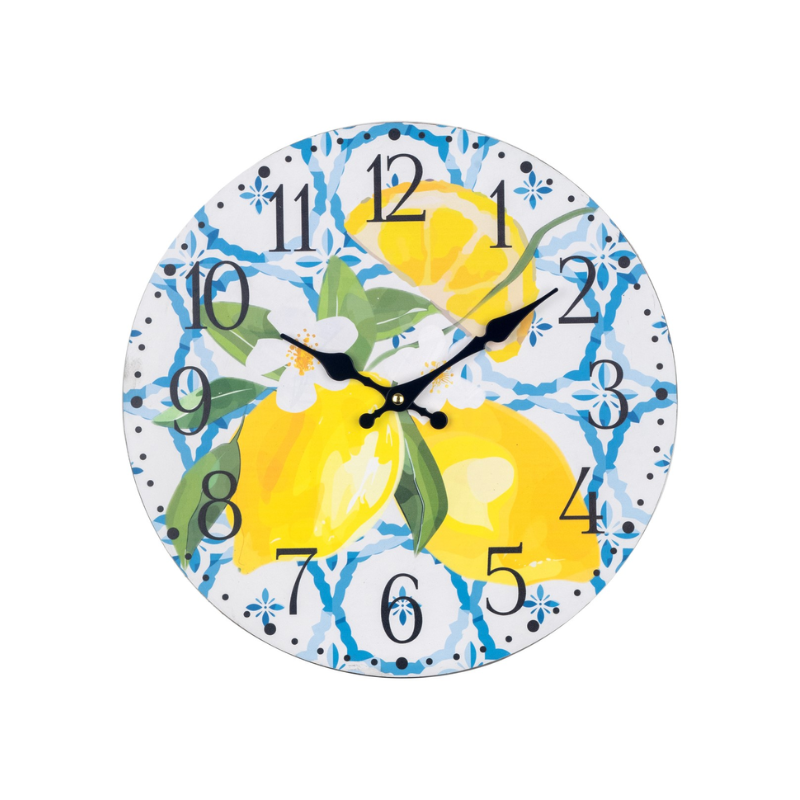 Reloj de pared LIMÓN de 34cm de diámetro fabricado en MDF. Funciona con 1 pila AA  no incluida.