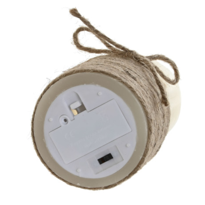 Vela de cera LED con movimiento blanca. Sus medidas son: 7,5 centímetros x 15 centímetros. Material: Cera parafina, yute y LED. Funciona con pilas 2AAA (no incluidas).