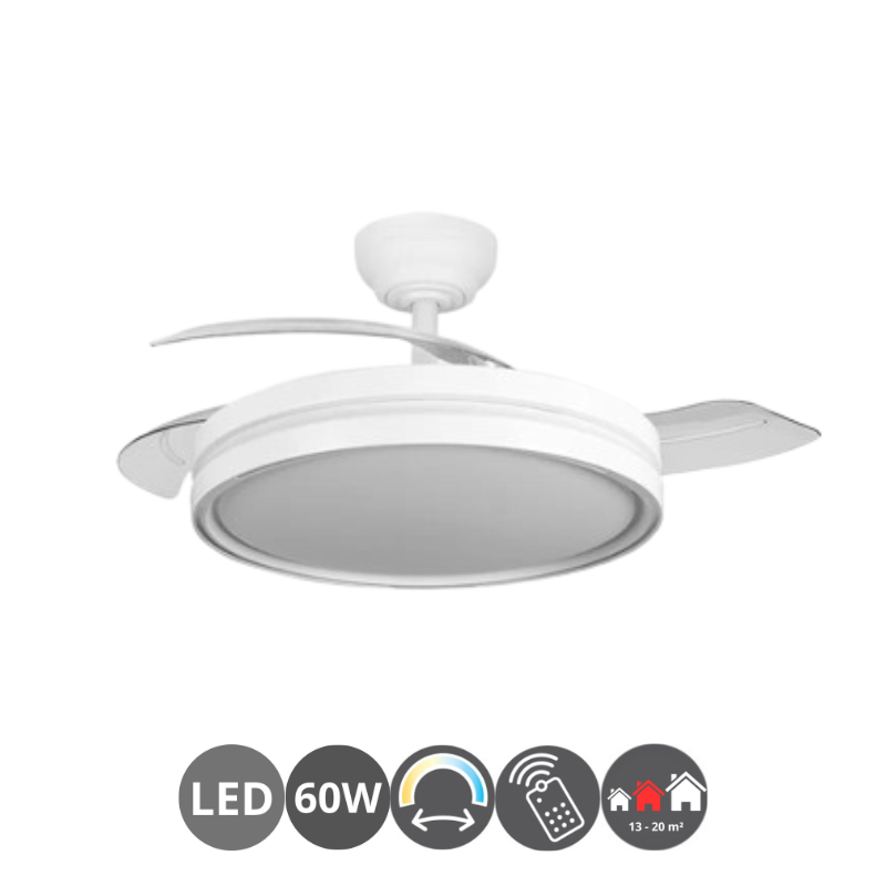 Ventilador de techo CAPITAN led de consumo 60 watt. Luminosidad 6980 lúmenes. 3 temperaturas de luz: 6500, 4300 y 3000 Kelvin con memoria y mando a distancia con temporizador incluido. Acabado blanco. Aspas desplegables ABS transparente. Motor DC 6 velocidades. Revoluciones por minuto 181 / 192 / 201 / 210 / 222 / 230 rpm. Consumo motor 8,3 / 11,2 / 15,1 / 19,1 / 23,9 / 30 watt. Control de aire verano/invierno. Hasta 20 metros cuadrados.