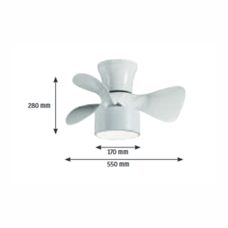 Ventilador FLY blanco led motor DC. Consumo 20 watt en luz y 36 watt motor.  Mando distancia con temporizador incluido. Metal y MDF blanco. 6 velocidades. Revoluciones por minuto 205 / 226 / 249 / 280 / 310 / 341 . Consumo 10,1 / 12,9 / 16,4 / 21,1 / 25,5 / 36 watt . Control de aire verano/invierno. Hasta 13  metros cuadrados.