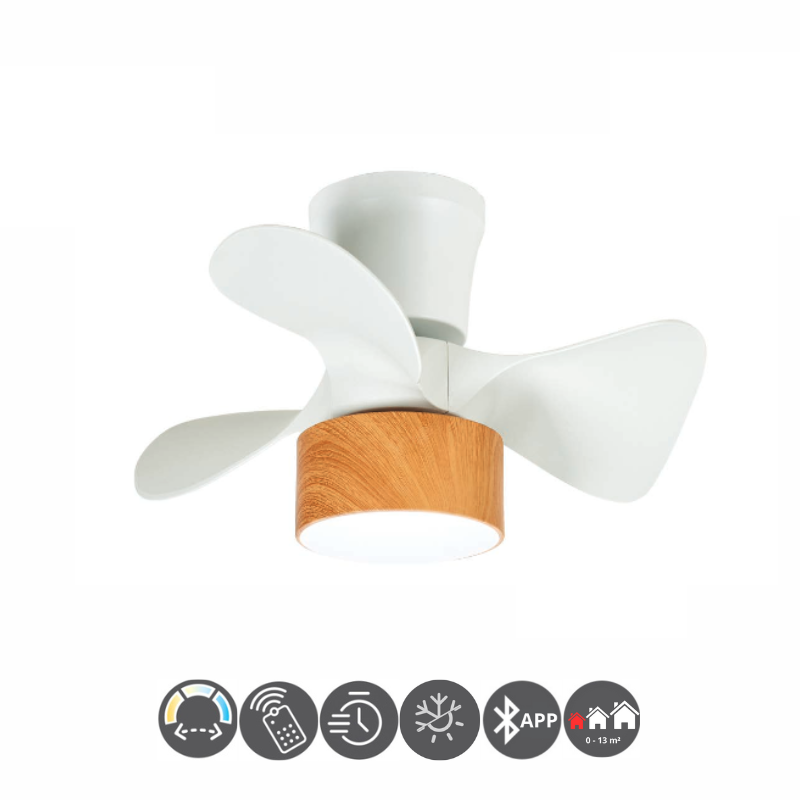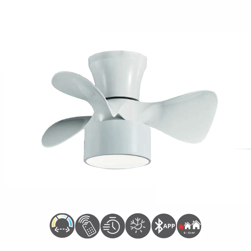 Ventilador FLY MAXI blanco led motor DC. Consumo 20 watt en luz y 36 watt motor. Mando distancia con temporizador incluido. Metal y MDF blanco. 6 velocidades. Revoluciones por minuto 205 / 226 / 249 / 280 / 310 / 341 . Consumo 10,1 / 12,9 / 16,4 / 21,1 / 25,5 / 36 watt . Control de aire verano/invierno. Hasta de 20 metros cuadrados.