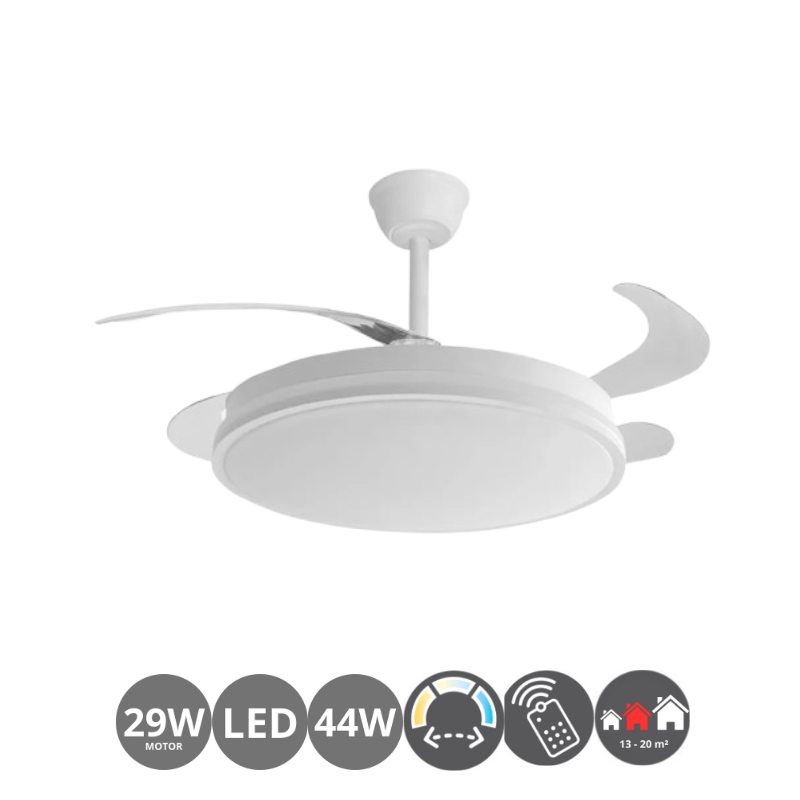 Ventilador de techo GUERRERO led de consumo 44 watt. Luminosidad 4900 lúmenes. 3 temperaturas de luz: 6500, 4000 y 3500 Kelvin con memoria y mando a distancia con temporizador incluido. Acabado blanco. Aspas desplegables ABS transparente. Motor DC 6 velocidades. Revoluciones por minuto 150 / 165 / 185 / 195 / 215 / 230 rpm. Consumo motor 7 / 10 / 14 / 19 / 23 / 29 watt. Control de aire verano/invierno. Hasta 20 metros cuadrados.
