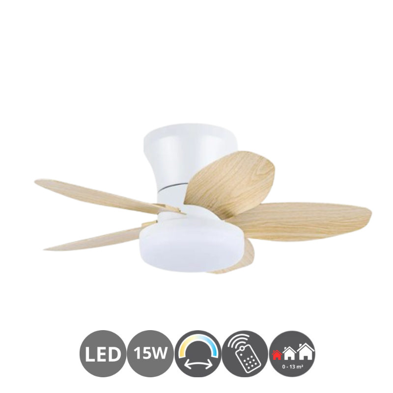 Ventilador de techo HARAN led de consumo 15 watt. Luminosidad 1800 lúmenes. 3000 – 4200 – 6500 Kelvin con mando a distancia con temporizador incluido. Acabado blanco. Aspas de ABS haya. Motor DC 6 velocidades. Revoluciones por minuto 306 / 351 / 380 / 400 / 420 / 440 rpm. Consumo motor 8,3 / 11,4 / 13,1 / 15 / 16,8 / 18,4 watt. Control de aire verano/invierno. Hasta 13 metros cuadrados.