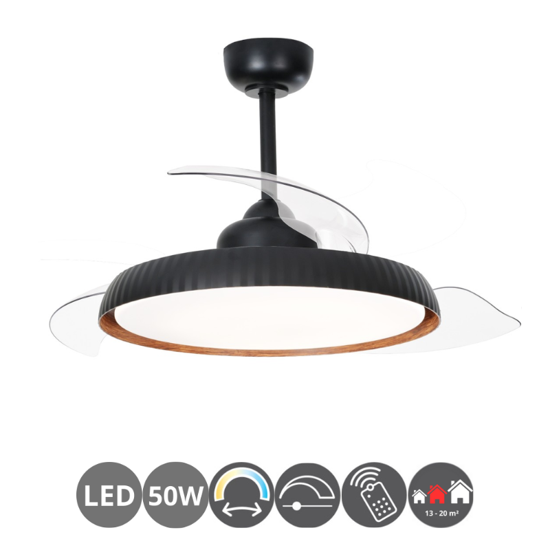 Ventilador de techo KANT led de consumo 50 watt. Luminosidad 6300 lúmenes. 3 temperaturas de luz: 6000, 4500 y 3000 Kelvin con mando a distancia con temporizador incluido. Acabado negro nordik. Aspas desplegables ABS transparente. Motor DC 6 velocidades. Revoluciones por minuto 179 / 198 / 220 / 235 / 255 / 279 rpm. Consumo motor 12,5 / 14,4 / 19,7 / 28,1 / 32,3 / 35,2 watt. Control de aire verano/invierno. Hasta 20 metros cuadrados.