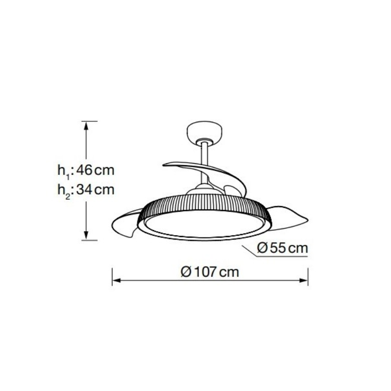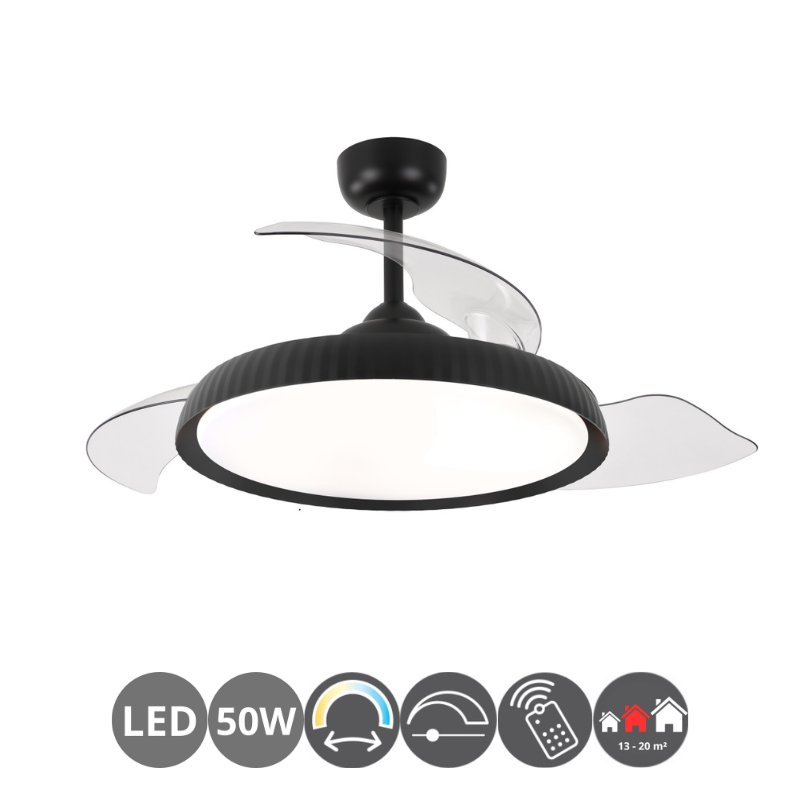 Ventilador de techo KANT led de consumo 50 watt. Luminosidad 6300 lúmenes. 3 temperaturas de luz: 6000, 4500 y 3000 Kelvin con mando a distancia con temporizador incluido. Acabado negro. Aspas desplegables ABS transparente. Motor DC 6 velocidades. Revoluciones por minuto 179 / 198 / 220 / 235 / 255 / 279 rpm. Consumo motor 12,5 / 14,4 / 19,7 / 28,1 / 32,3 / 35,2 watt. Control de aire verano/invierno. Hasta 20 metros cuadrados.