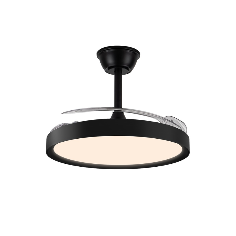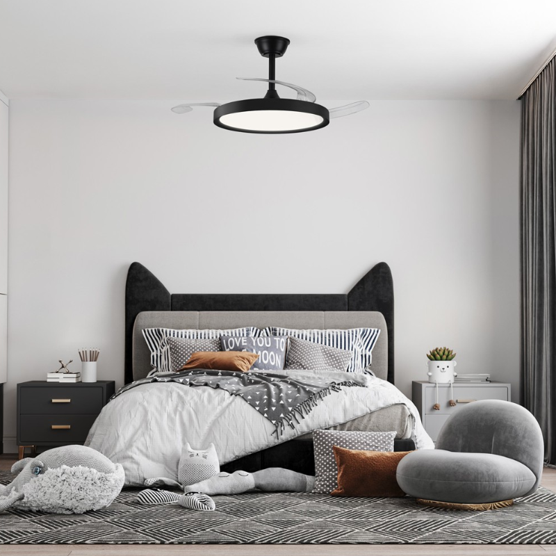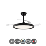 Lámpara ventilador de techo led POLARIS 43 Watt 3 Aspas desplegables 485/106cm diámetro 6 velocidades mando a distancia con memoria negro. Motor DC. Consumo motor 27 watt. Luminaria de 4430 lúmenes. Zona aconsejada: Habitación, salita… Hasta 20 metros2