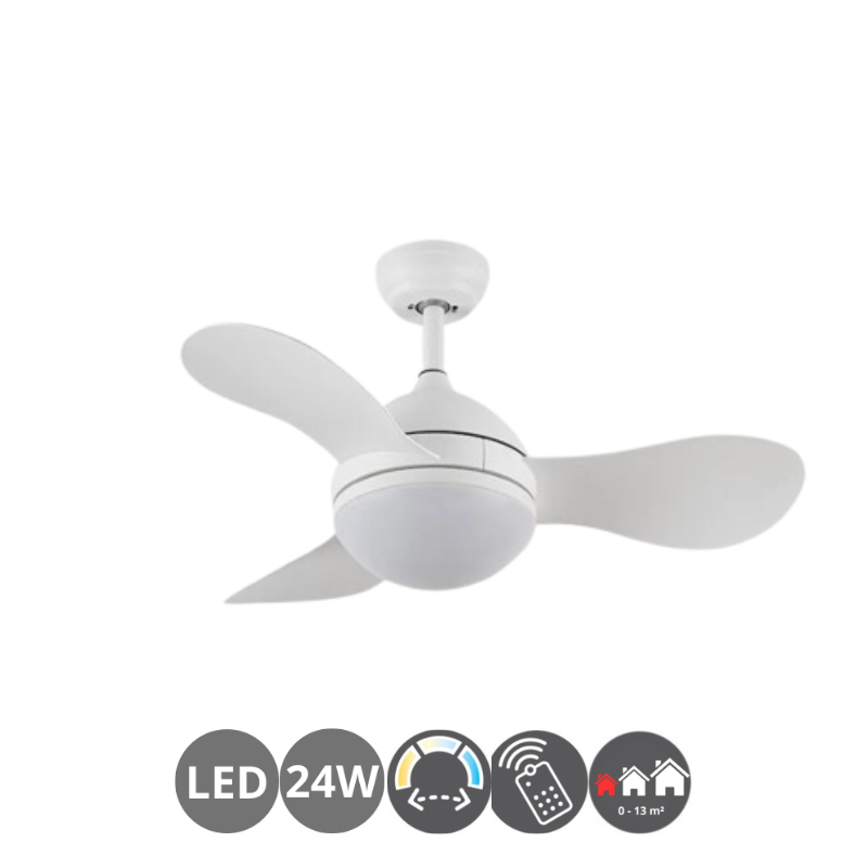 Ventilador de techo SOLIDO led de consumo 24 watt. Luminosidad 2640 lúmenes. 3 temperaturas de luz 6500, 4000 y 3000 Kelvin con memoria y mando a distancia con temporizador incluido. Acabado negro. Aspas de ABS negro. Motor DC 6 velocidades. Revoluciones por minuto 143 / 152 / 185 / 202 / 222 / 238 rpm. Consumo motor 4,5 / 5,6 / 7 / 9,5 / 12 / 14,5 watt. Control de aire verano/invierno. Hasta 13 metros cuadrados.