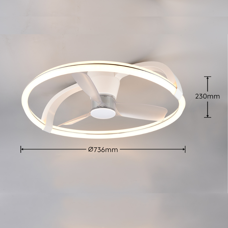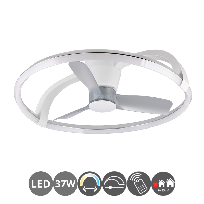 Ventilador de techo STOCKHOLM led de consumo 37 watt. Luminosidad 4300 lúmenes. 3 temperaturas de luz 2700 – 6500 Kelvin con memoria y mando a distancia con temporizador incluido. Acabado blanco. Aspas de plástico blanco. Motor DC 6 velocidades. Revoluciones por minuto 180 / 250 / 300 / 330 / 350 / 380 rpm. Consumo motor 4 / 8 / 12 / 16 / 20 / 25 watt. Control de aire verano/invierno. Hasta 13 metros cuadrados.