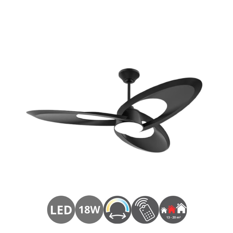 Ventilador de techo TARAZONA led de consumo 18 watt. Luminosidad 2250 lúmenes. 3000 – 4500 – 6500 Kelvin con mando a distancia con temporizador incluido. Acabado negro. Aspas de ABS negro. Motor DC 6 velocidades. Revoluciones por minuto 94 / 111 / 129 / 142 / 161 / 182 rpm. Consumo motor 5,8 / 8,7 / 13,6 / 19,4 / 26,4 / 37,9 watt. Control de aire verano/invierno. Hasta 20 metros cuadrados.