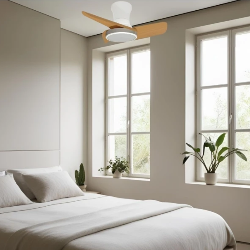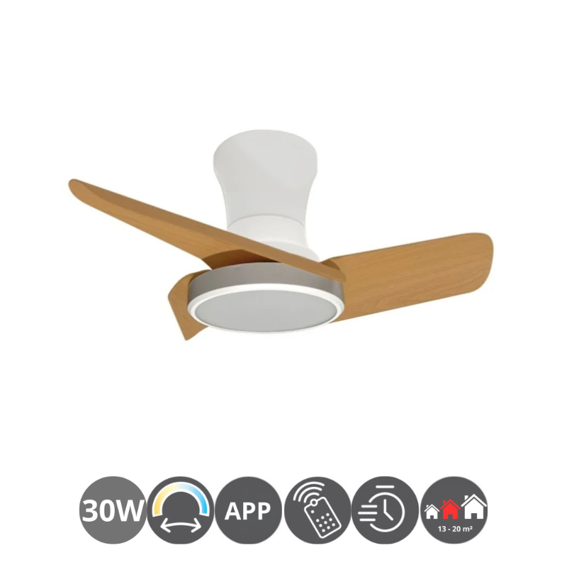 Lámpara ventilador de techo compacto SKY led 30 watt, 3000 lúmenes, 3 aspas oscilantes 60cm diámetro 6 velocidades Mando a distancia con memoria, temporizador y aplicación APP blanco haya. Motor DC.  Zona aconsejada: Habitación pqueña, baño, cocina… hasta 13m².