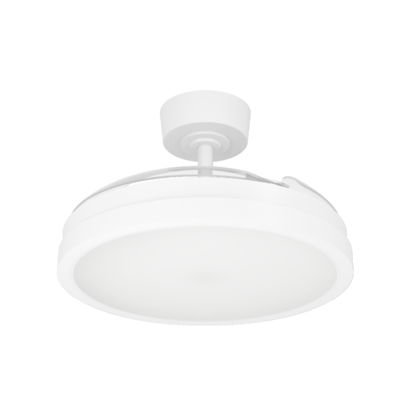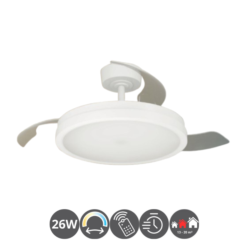 Lámpara ventilador de techo MALPICA led 26 watt, 3500 lúmenes, 3 aspas desplegables 50/98 cm diámetro 6 velocidades Controles mediante mando a distancia y memoria. Temporizador de 1/4/8 horas blanco. Apto para techo inclinado hasta 8º de inclinación. Motor DC. Zona aconsejada: Habitación, dormitorio, estancia hasta 20m².