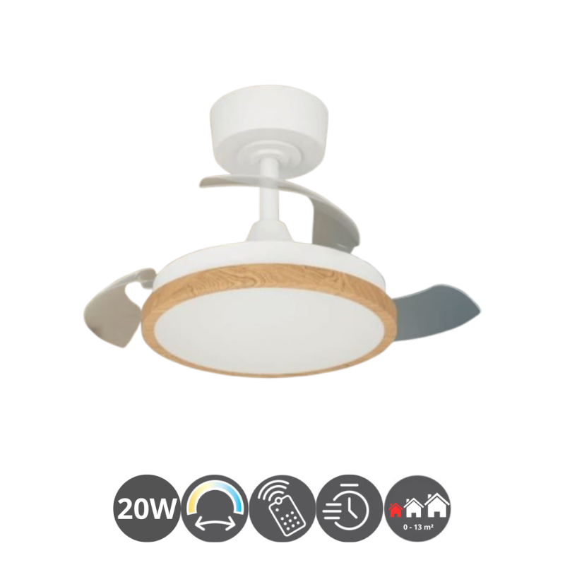Lámpara ventilador de techo MALPICA led 24 watt, 2900 lúmenes, 3 aspas desplegables 35,8/77 cm diámetro 6 velocidades Controles mediante mando a distancia y memoria. Temporizador de 1/4/8 horas blanco haya. Apto para techo inclinado hasta 8º de inclinación. Motor DC. Zona aconsejada: Habitación, dormitorio, estancia hasta 20m².