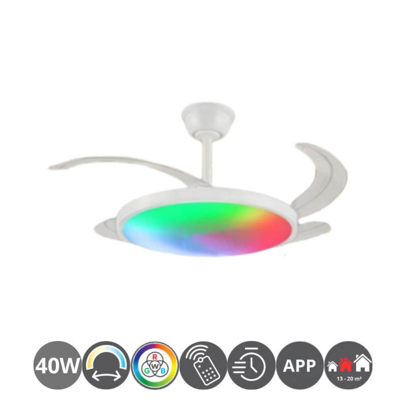 Ventilador de techo led MELODY L de consumo 40w + 10w RGB. Luminosidad 4000 lúmenes. Temperatura de luz graduable: 3000 – 4200 – 6000 Kelvin con memoria, mando a distancia y APP. Acabado blanco. 4 aspas desplegables transparentes. Motor DC 6 velocidades. Revoluciones por minuto 170 / 182 / 195 / 218 / 245 / 265rpm. Consumo motor 6,9 / 8,2 / 10 / 15,6 / 20,8 / 29,5 watt. Control de aire verano/invierno. Hasta 20 metros cuadrados.