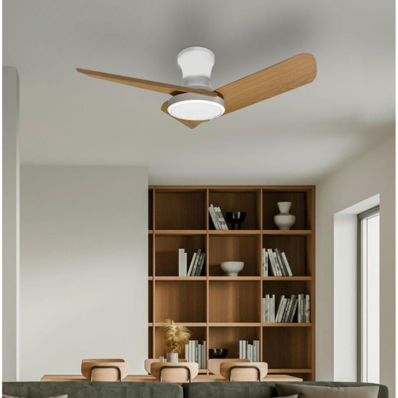 Lámpara ventilador de techo SKY MAXI led 30 watt, 3000 lúmenes, 3 aspas oscilantes 80cm diámetro 6 velocidades Mando a distancia con memoria, temporizador y aplicación APP blanco haya. Motor DC.  Zona aconsejada: Habitación, dormitorio hasta 20m².
