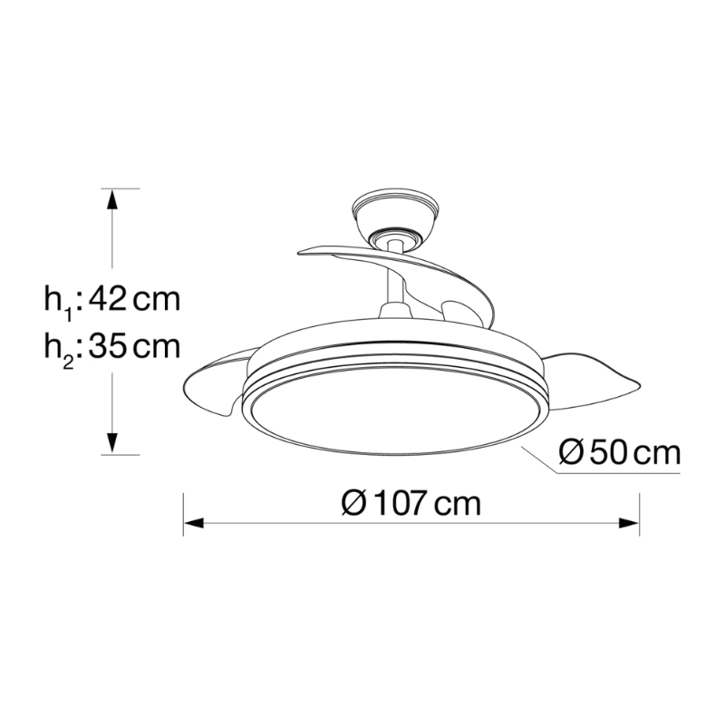 Ventilador de techo XALOC led de consumo 50 watt. Luminosidad 5800 lúmenes. 3 temperaturas de luz: 6000, 4500 y 3000 Kelvin con mando a distancia con temporizador incluido. Acabado níquel satinado. Aspas desplegables ABS transparente. Motor DC 6 velocidades. Revoluciones por minuto 188 / 209 / 218 / 225 / 239 / 254 rpm. Consumo motor 7,5 / 10,4 / 13,7 / 18,1 / 24,3 / 30 watt. Control de aire verano/invierno. Hasta 20 metros cuadrados.